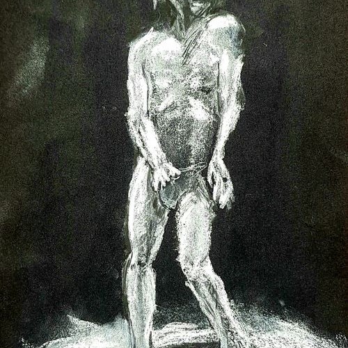 Conte blanc on black paper. Hopefully the first of a series depicting the Japanese dance form Butoh.