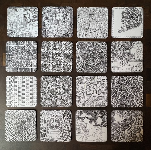 32 drawings in 3 weeks! Front & Back, 9cm square card stock, 05 Micron & Zebra Sarasa