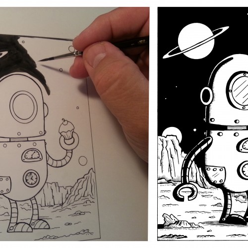 Brush and pen inking of a robot character. The 4th one in a series on Bristol paper.