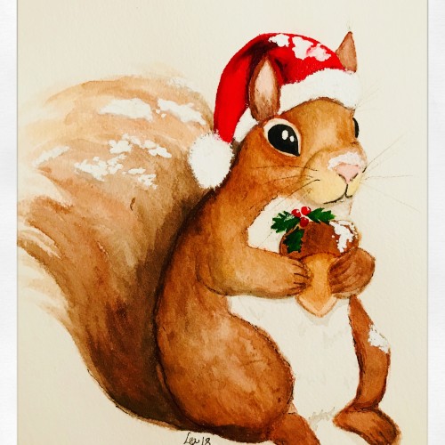 Watercolor squirrel jauntily wearing a Santa hat and bringing presents
