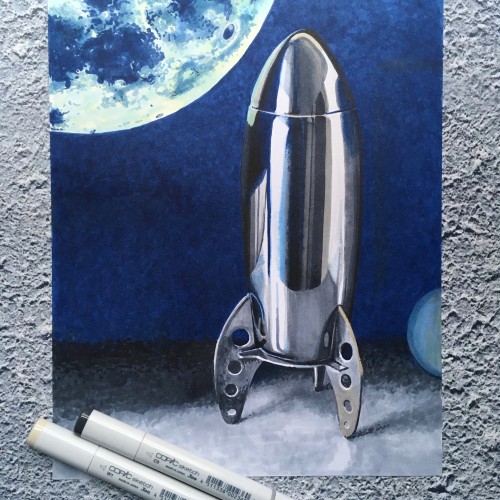 MacKendrew Arts, Lunar Rocket, 2019, Drawing done with Copic Sketch Markers on X-Press It paper.