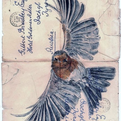 Ballpoint pen humming bird drawing on vintage wedding invite.