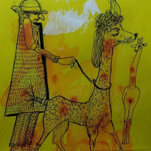 A badger with a geometric design mirrored by a small still life with a pocket knife, child's pacifier and a book of Haiku.