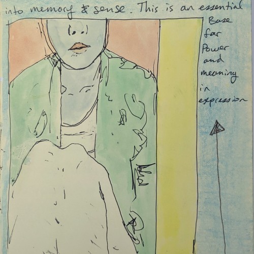Fifty of us sat in that room, each one staring at a phone or scribbling in a notebook, killing time. The lawyers asked their questions, picking us off one by one like a slow game of dodgeball. I wasn’t chosen, so I drew instead—earbuds, slouched shoulders, the hum of waiting caught in a few quick lines.