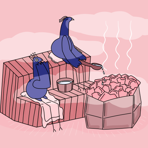 One of these peacocks is enjoying a steamy hot sauna and the other one … well the other one is just suffering.