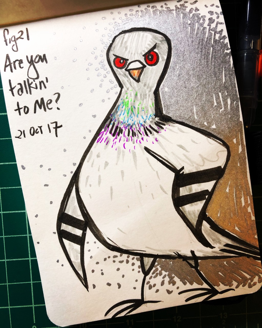 angry, brush and ink, doodle, gel pens, inktober, metallic sharpie, pigeon, sketch