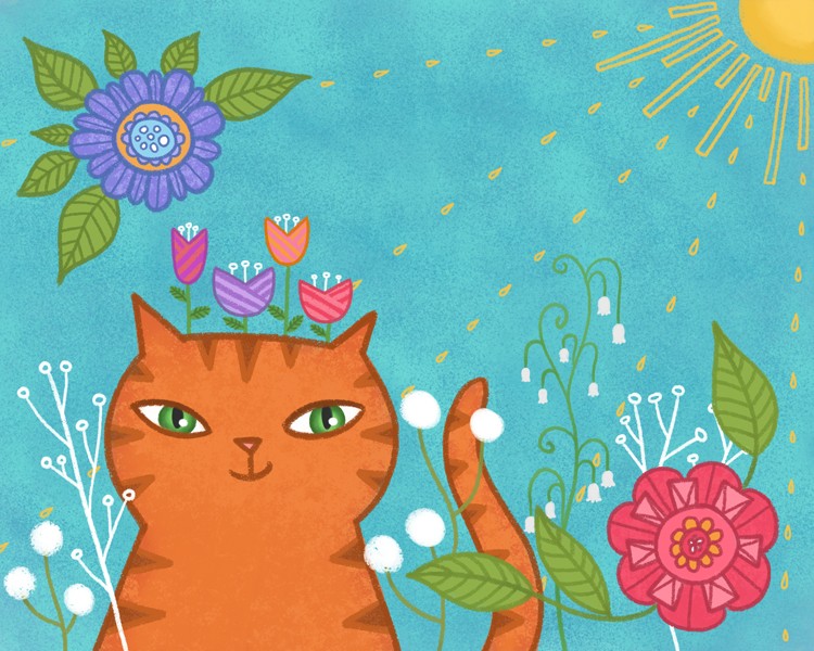 cat, floral, flowers, garden, kitty, meow, nature