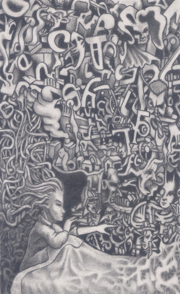 (2B pencil on a 139mm x 89mm postcard) Another Dreamscape drawing that uses random shading to build up imagery in a surrealist automatism technique.