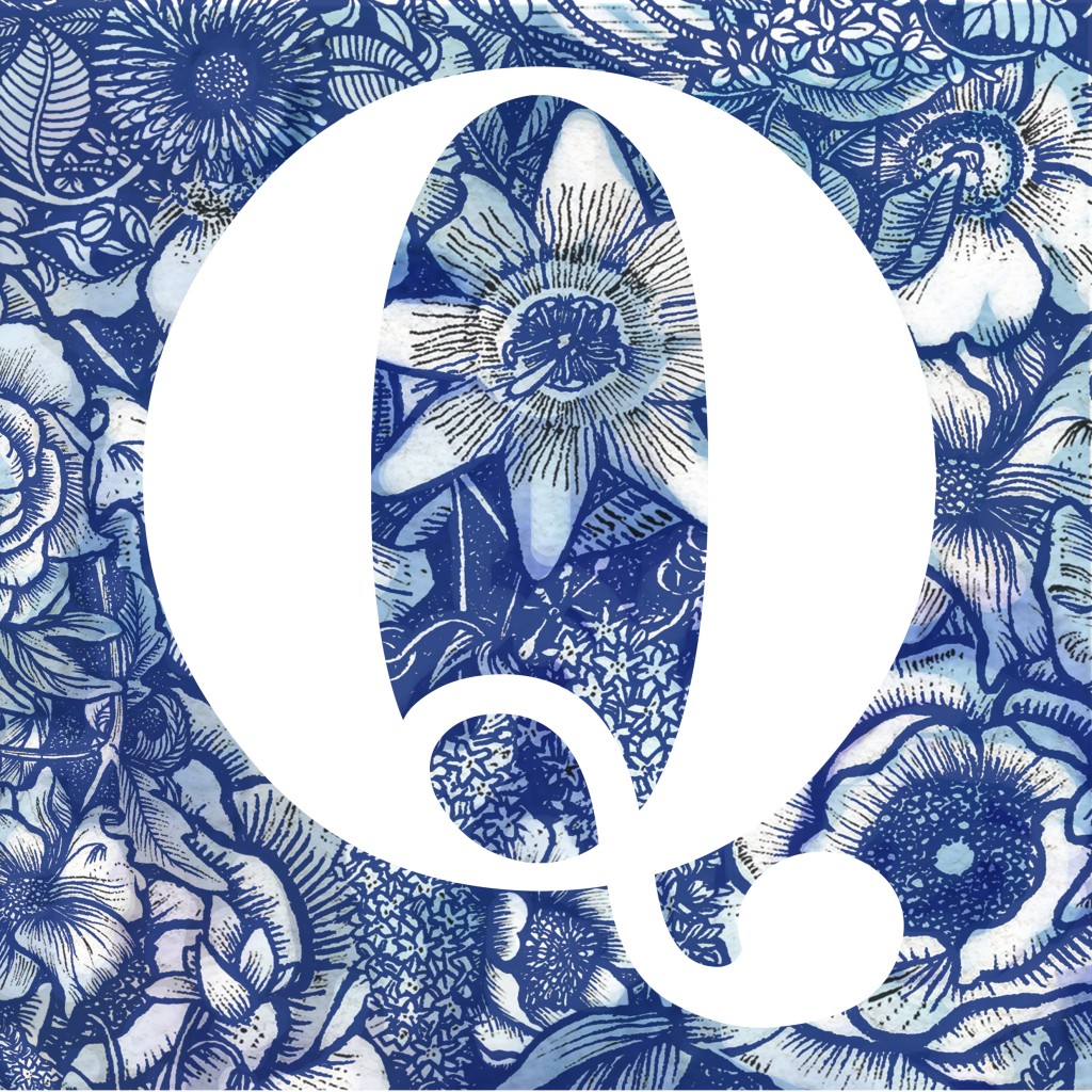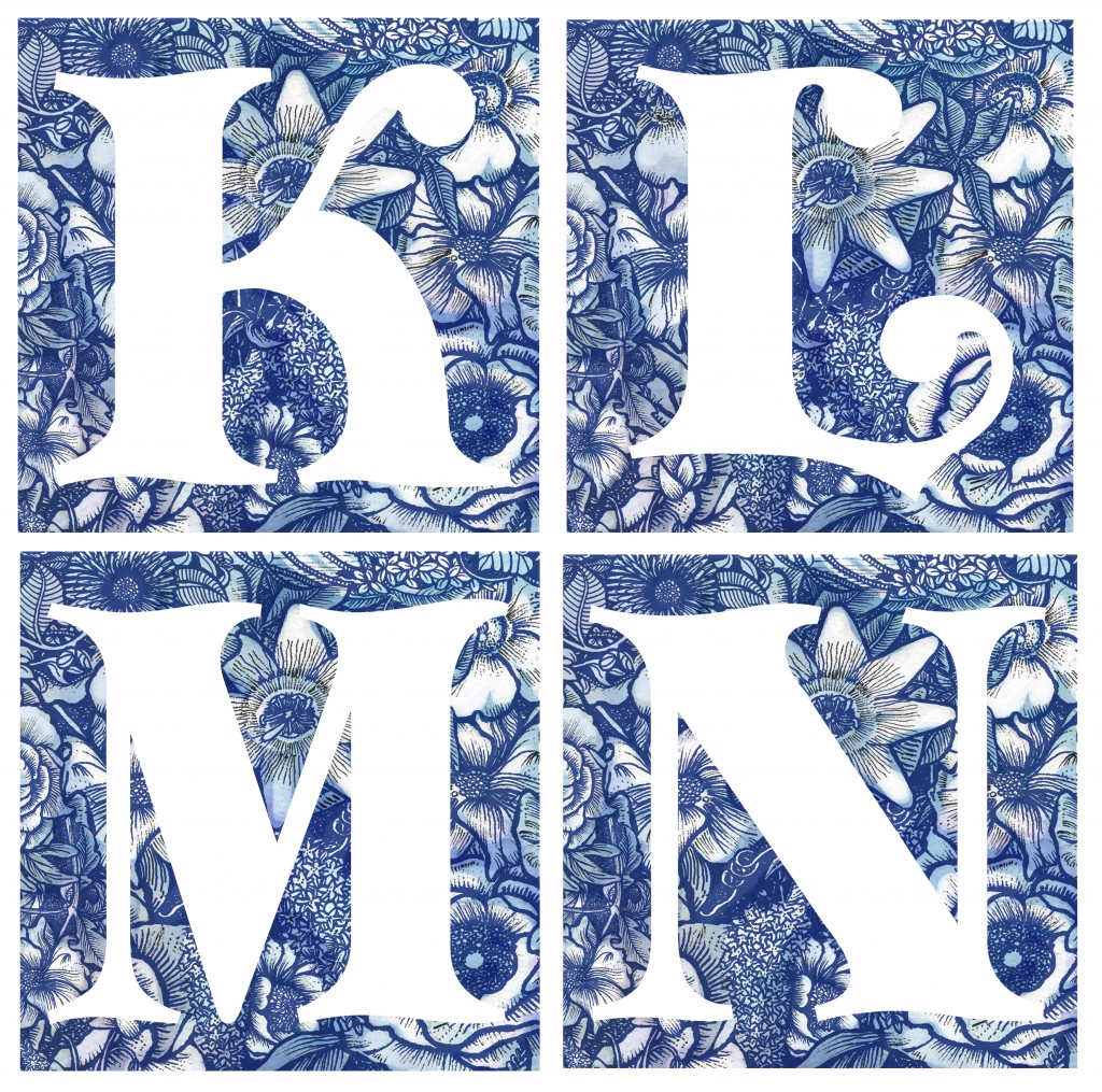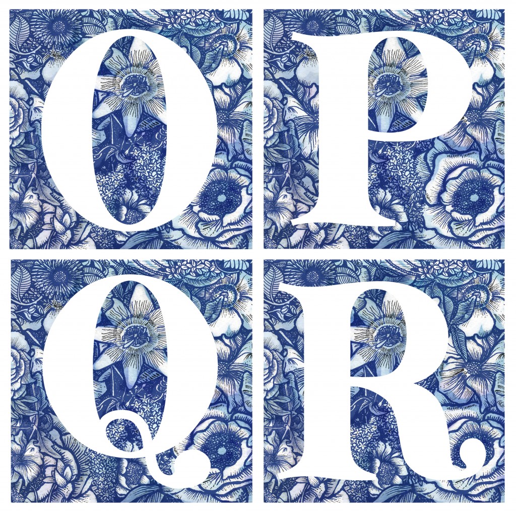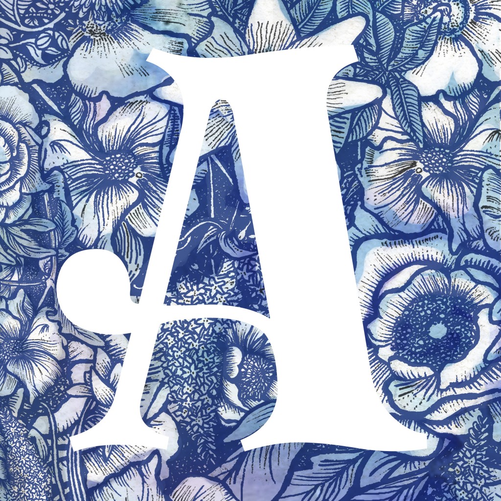 The bold white initial letter is sitting on a blue pen and ink hand drawn illustration with a watercolour background.