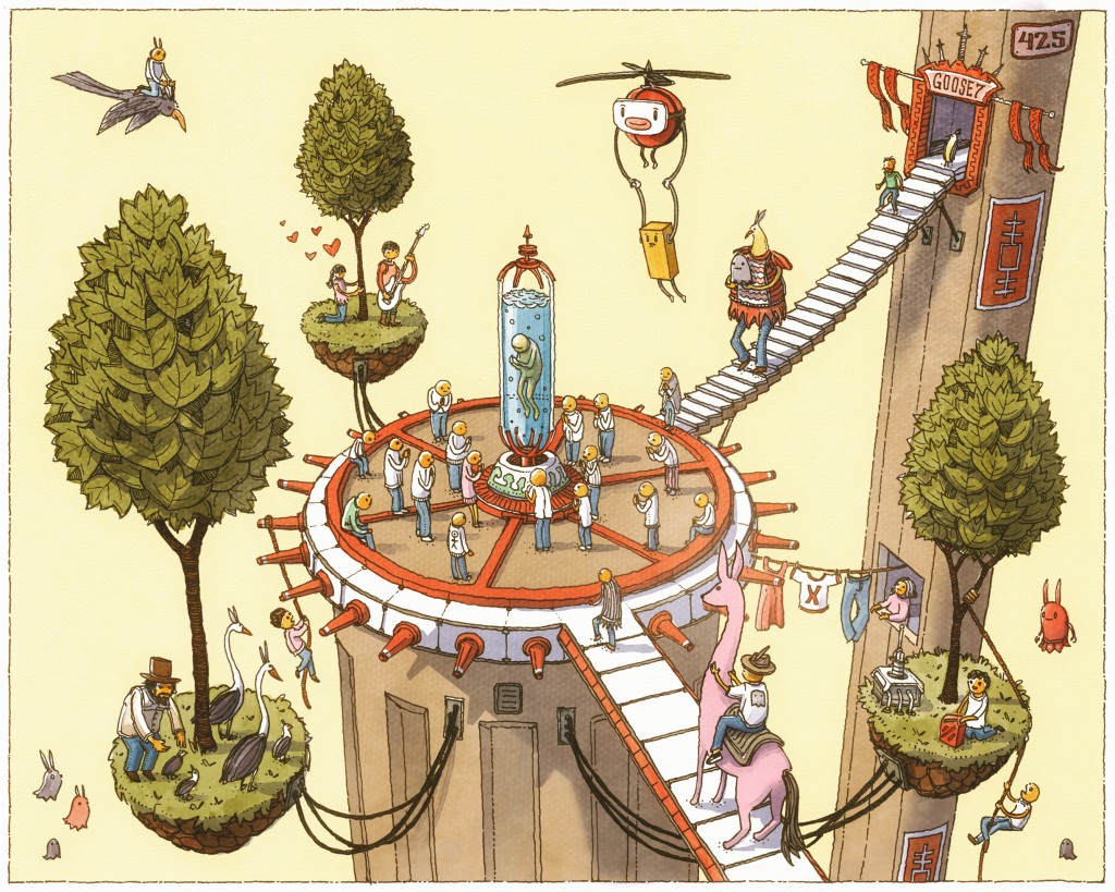 They gather around, grateful, sending prayers up just to thank. (Directed at the man selected to be in the tank.) Who knows why that man is bare in there, and to be frank- They're thankful that it's him, not them. You can take that to the bank!