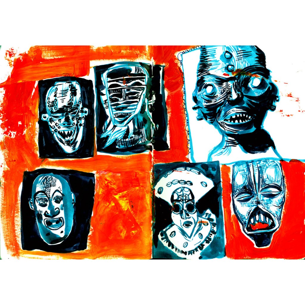 There's a moment in Black Panther where Michael B Jordan's character steals an African mask from a museum. When the other character with him asks why, he says "I'm just feelin' it." The mask he grabbed was VERY cool, and I kind of wanted one, too. But, short of stealing things out of museums, I guess I'll have to draw them. If you click on the image, you'll see a full spread of them.