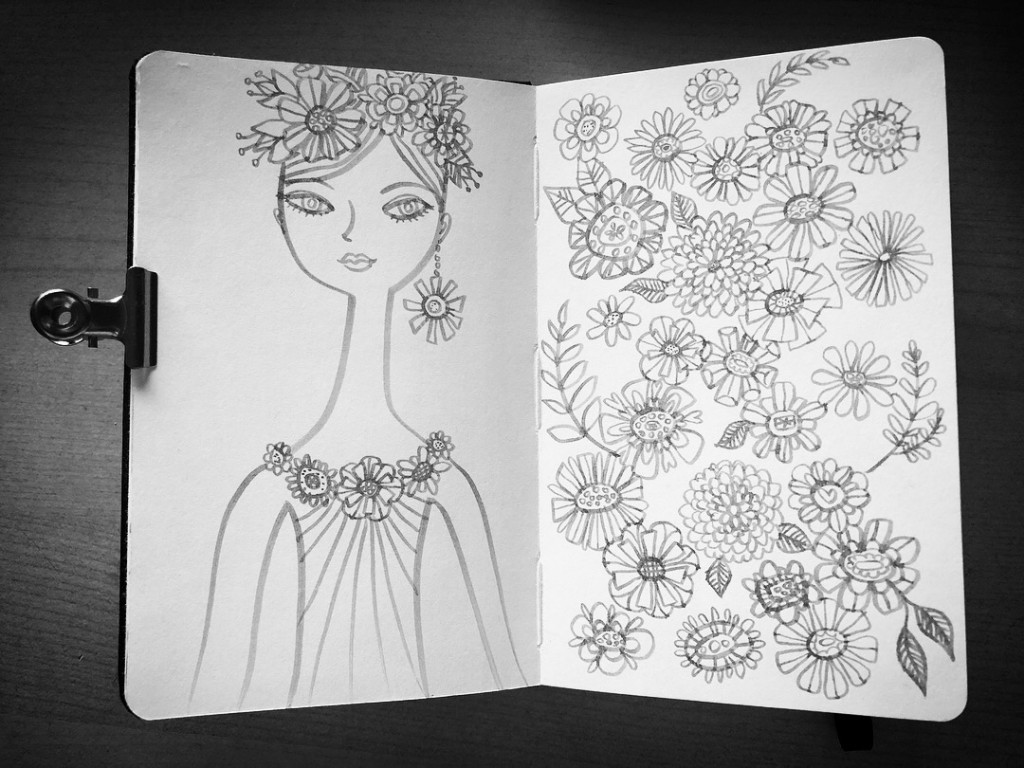 brush pen, doodle, drawing, flora, floral, flower, flowers, girl, illustration, lady