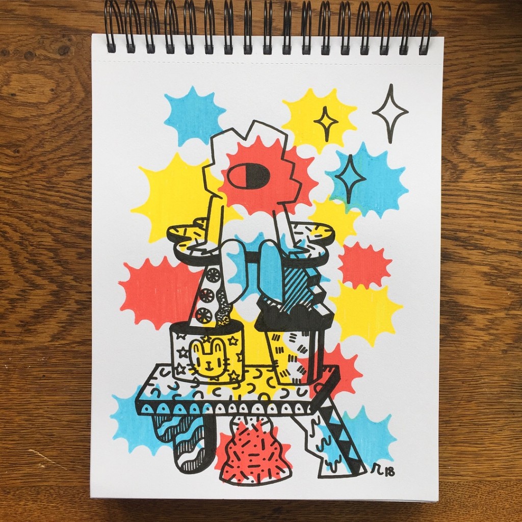 Oh this is a cool design. The palette is ALMOST like primary colors but they're a little "off" in a good way... So the trio of colors give this good warm feeling, and the design is bold... this would be good on a hand bag or T-Shirt. But it's good as art too.