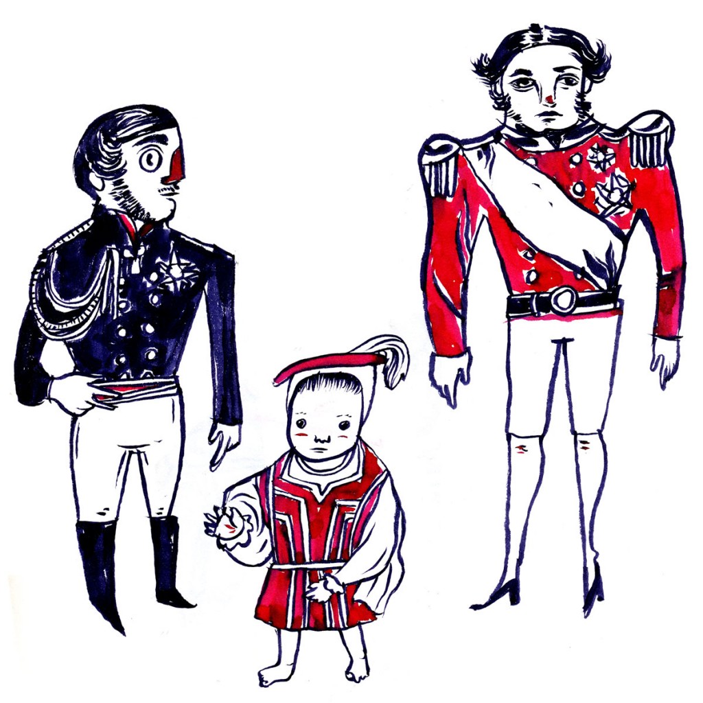 These are ink applied with a brush/watercolor pen to a fairly sturdy sketchbook. They mostly feature aristocrats and irritated children.