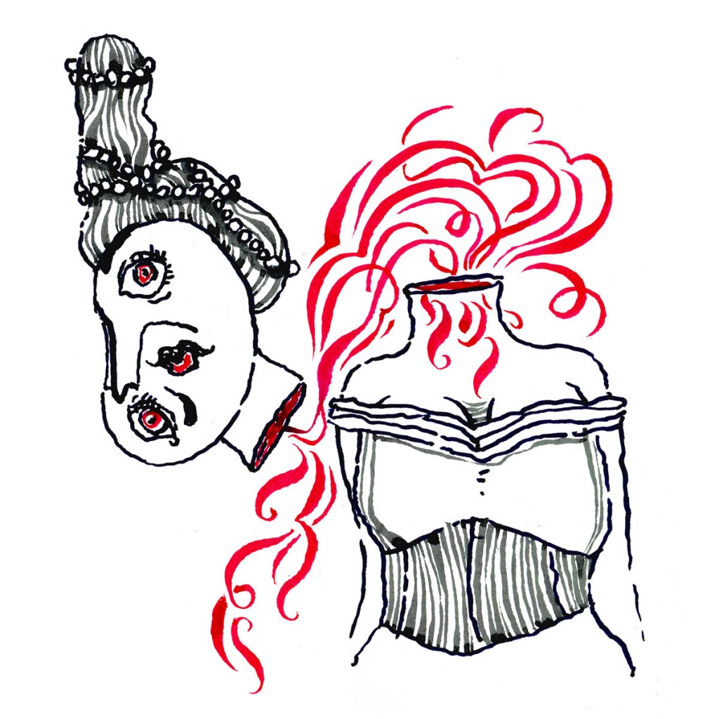 Working on a tattoo for myself that's based on the Disney Magic Kingdom's Haunted Mansion. The Tightrope Girl is part of the expanding elevator in the beginning of the ride. I changed the shape of the original painting to a coffin; simplified everything down; and added some flourishing. I'm not great at flourishing yet.