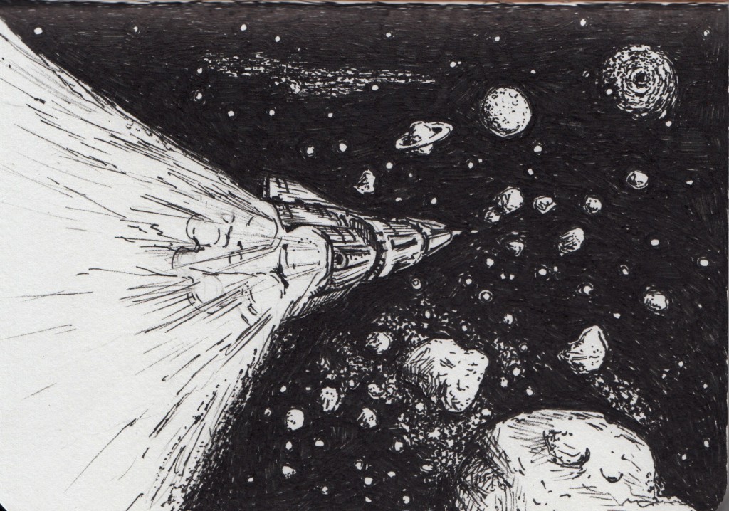 black and white, drawing, fineliner, space