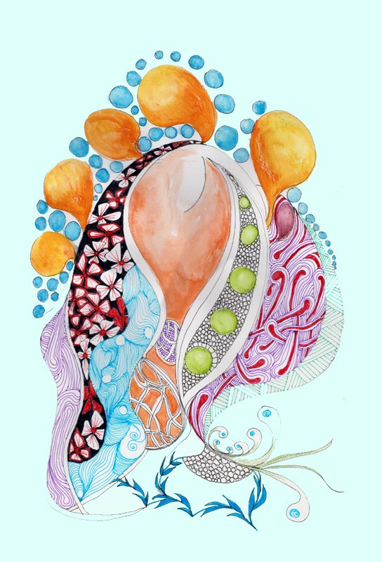 A3 The fish (scale- and eyeless) swam into a motley selection of patterns filled into a scribble/string. Done with graphic pens and watercolour pencils blended with water.