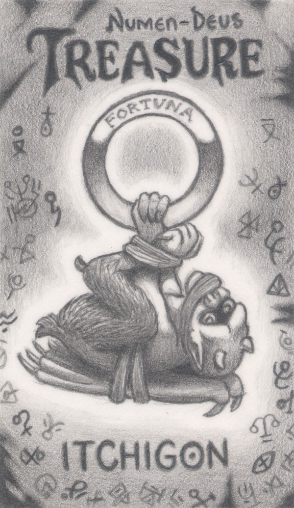 (HB pencil on 85mm x 50mm card) For his crimes against her, Itchigon was condemned by the goddess Fortuna to remain forever as part of this amulet, bringing nothing but good luck to those that own it.