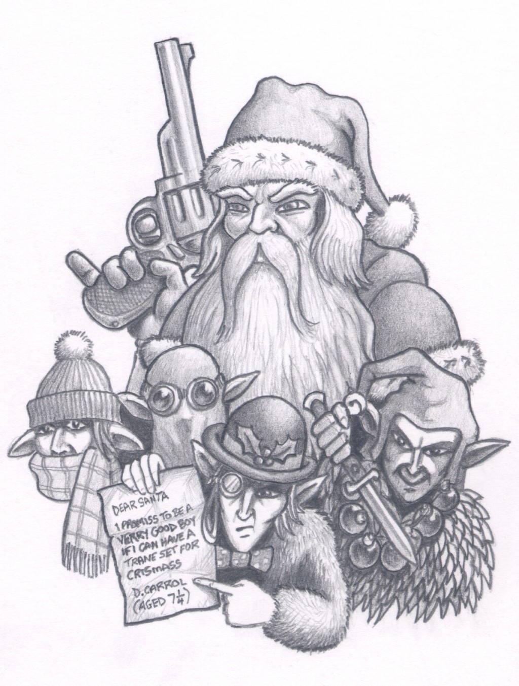 (HB pencil on A6 card) An image I printed on cards that I sent out in 2014 that came with a story about how you should never make promises in letters to Santa!