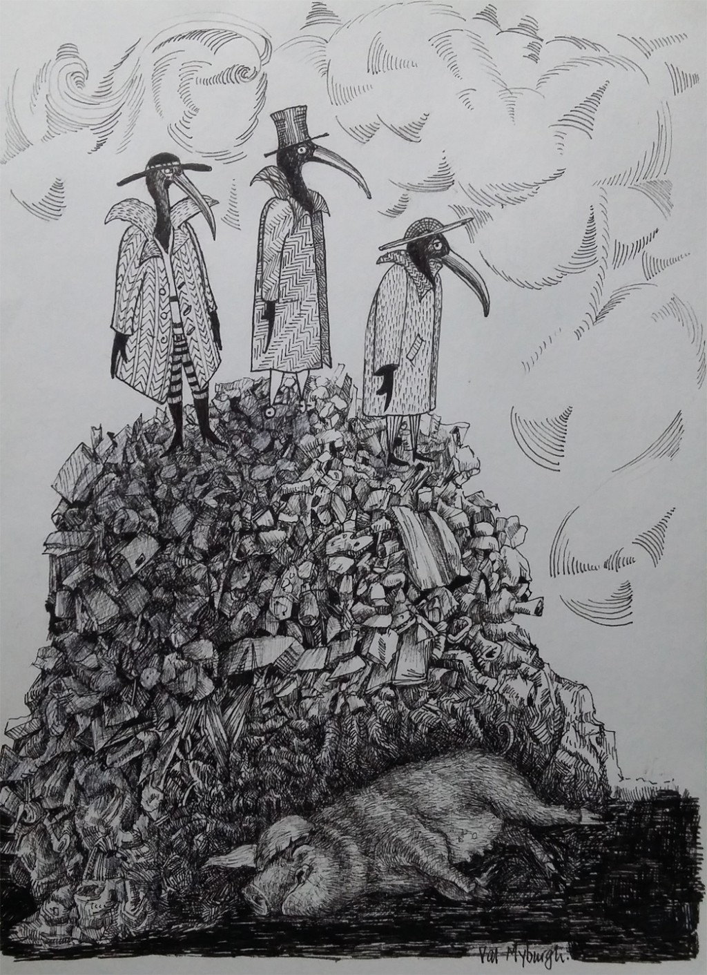 @Chrisho Ok now I understand. If I may explain, the birds are not Penguins but Sacred Ibis (hence the title 'Sacred Ibis People'. This little scene is one I witnessed a couple of weeks ago on a nearby farm. On top of a rubbish heap were three or four sacred ibis and to me they looked like old men standing around, discussing world affairs. Also on this farm is a pet pig called Crackling, and she frequently sleeps at the bottom of the rubbish heap. I just put them all together in one drawing. There is no sinister or cruel intention here but rather an effort at whimsy and humour. Of course the rubbish heap could be construed on many different levels, but that is up to the viewer.