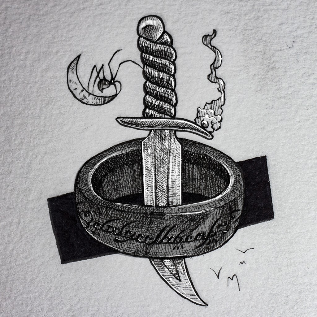 art, artwork, black and white, fan art, illustration, ink drawing, inktober, knife, lord of the rings, monochrome, noir, pen, pen and ink, pen drawing, pen sketch, spider