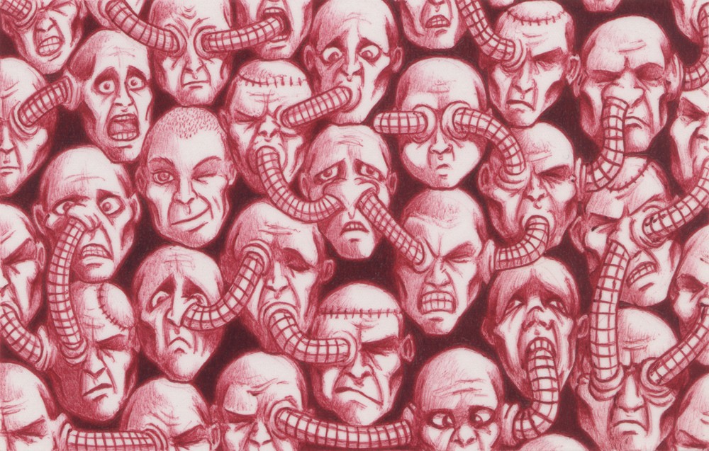 (Red biro on a 89mm x 139mm postcard) When technology becomes so intrusive on our daily lives that we feel we simply can't live without it, then perhaps the one-eyed man is truly king.