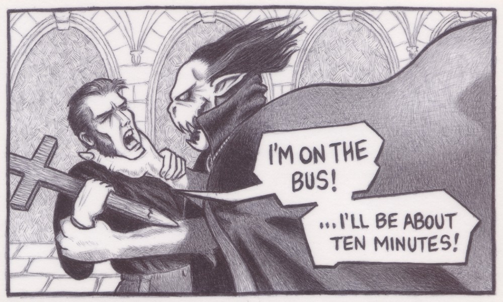 (Black biro on a 75mm x 125mm notecard) A juxtaposed image of a comic book type image with an unrelated speech caption. The type of thing you tend to hear from those on their mobile phones on buses.