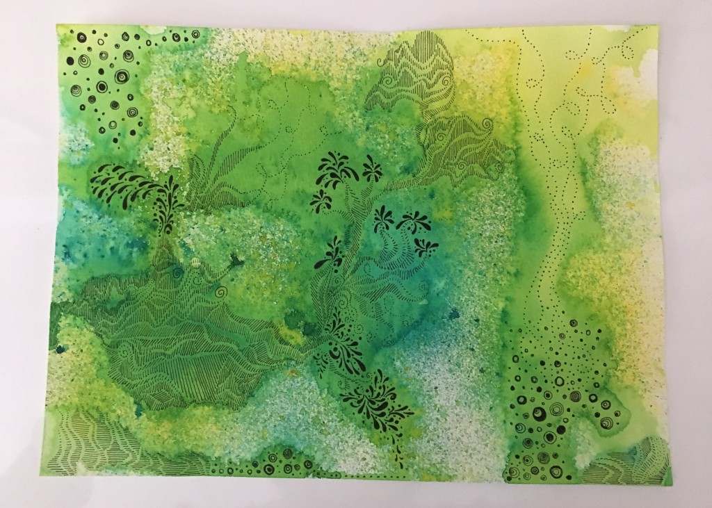 I sprayed the inks on dry paper and let it dry before I doodled with a fine point pen.