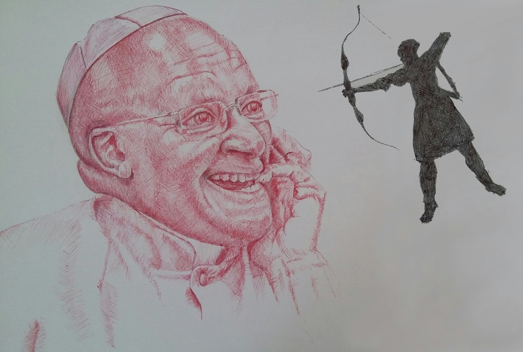 A sketch on the theme of Archery. It could also be called Red Bishop to Black Knight. Ballpoint pen.