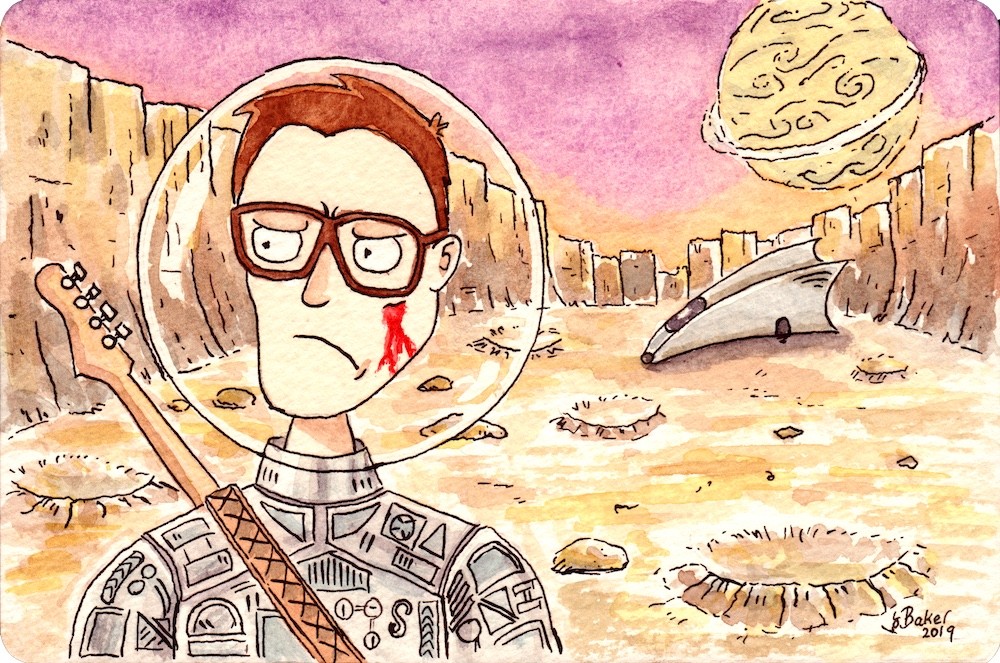 I participated in an art swap challenge at Sktchy where I had to draw someone randomly assigned to me in a "space" theme. I'm so pleased with how this one turned out! Pen and watercolour, 6x4". Would love to hear what you think the story