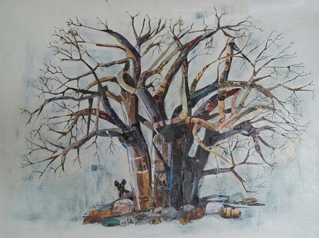 I made a collage of my favourite tree, a baobab, using postage stamps. The wild dog puppy seemed to creep in from somewhere!