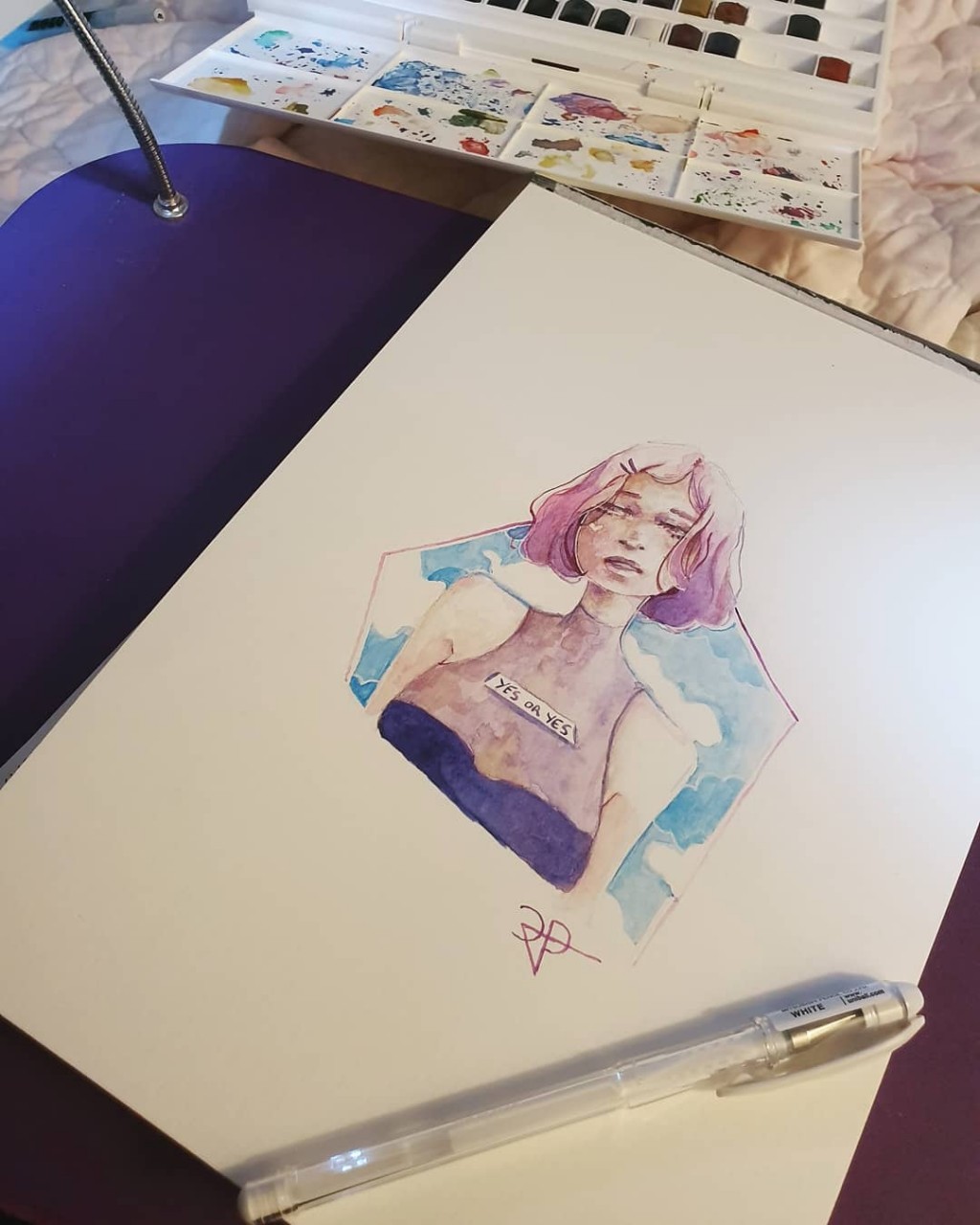 A draw this in your style challenge for _pizzabacon on Instagram. This is her OC, drawn using watercolours in my style.
