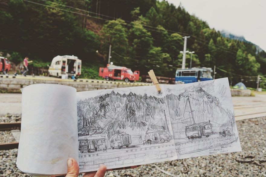 Another sketch from Austria during the Nomadic Village in the first location with our Gallery on Wheels and other beautiful vans and buses! Austrian mountains are simply beautiful !! :) enjoy