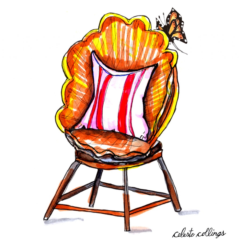 Butterfly searching for the perfect chair..Goldilocks zone. Colored pencil, watercolor and ink.