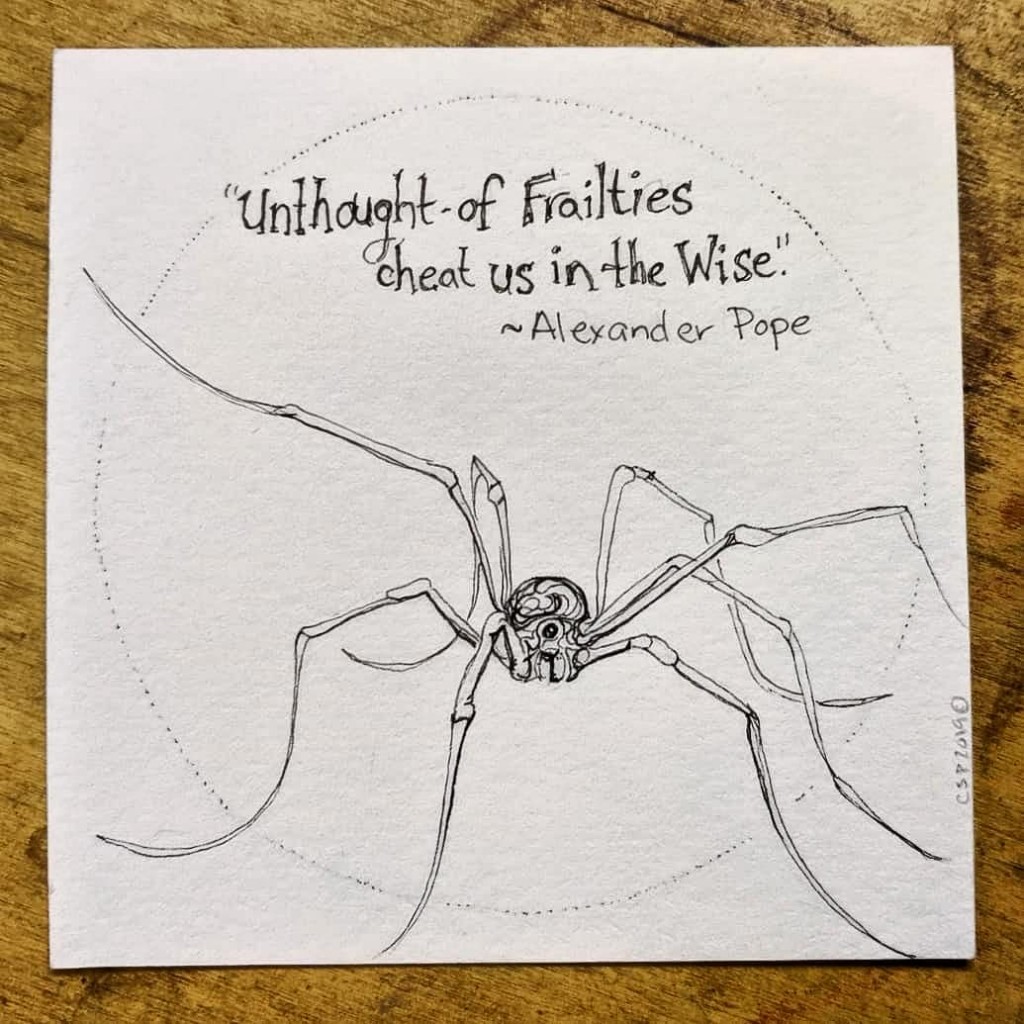 "Unthought-of Frailties cheat us in the Wise." ~ Alexander Pope, Moral Essays (1731-35), Epistle To Temple, line 69. I really had to ponder this quote and figure out how to illustrate it. A spider came to mind...so tiny and fragile in comparison yet invokes so much fear. Then considered a daddy long leg.