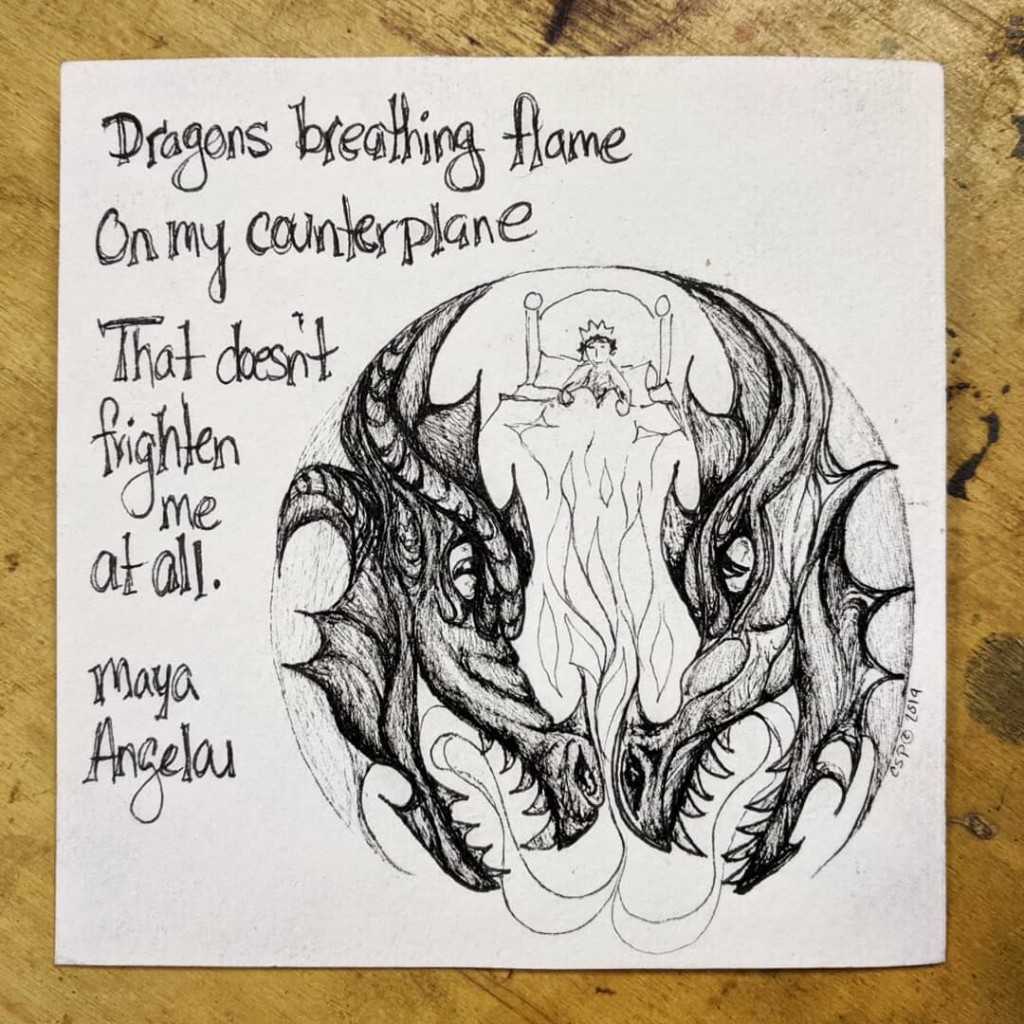 "Dragons breathing flame On my counterpane That doesn't frighten me at all.: ~ poem "Life Doesn't Frighten Me" by Maya Angelou . Please google or connect to link to read the complete poem - it is one all children hear:) this one is illustrated by a master artist: https://www.brainpickings.org/2013/05/03/life-doesnt-frighten-me-maya-angelou-basquiat/