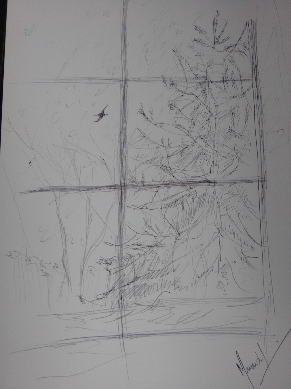 Pen drawing of a tree and the snow falling from my window