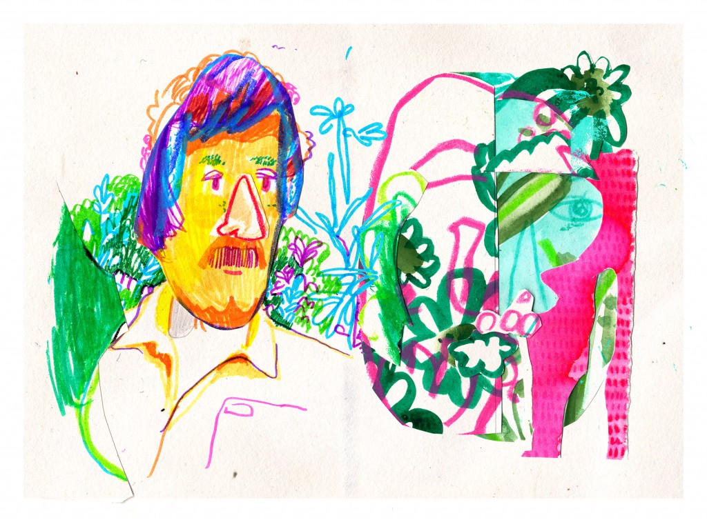 Mixed media doodle collage over Carhartt ad - using oil pastels, pen, watercolor, highlighter and glue