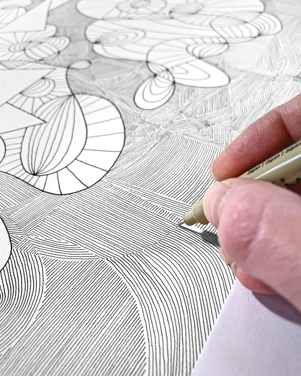 Zoomed in shot of "Pattern Interrupt". 2020. Size: 32" x 40" / Micron pens on archival museum board. This piece was all drawn freehand - no rulers or measuring tools were used to create this artwork.