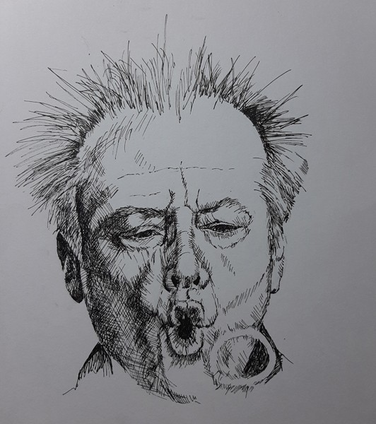 A Big Black Horse and a Cherry Tree. Ball point pen on a paper plate