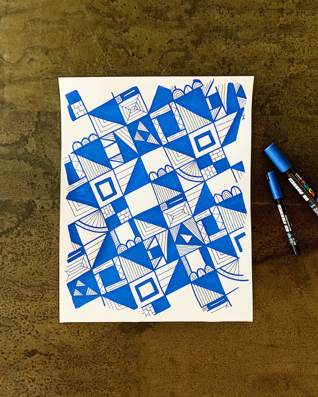 This sketchbook is all about triangle patterns! Each page starts with a base layer of connecting triangles. From there, I fill in different patterns on each page, challenging myself to come up with new ideas for each page.