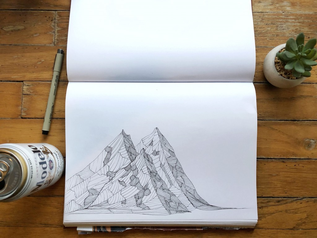 black and white, doodling, drawing, drawn, illustration, line work, mosaic, mountains, pen and ink, pen lines, sketchbook