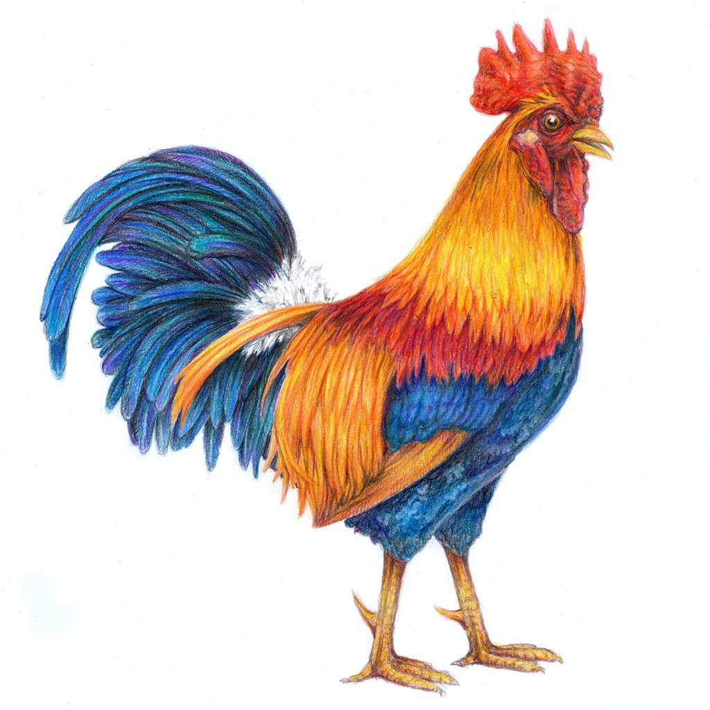 Our rooster was killed by a weasel while defending his hens a few years ago, so this fellow was referenced from various on-line photos. He's drawn with colored pencils on Strathmore 400 Smooth Bristol board paper.