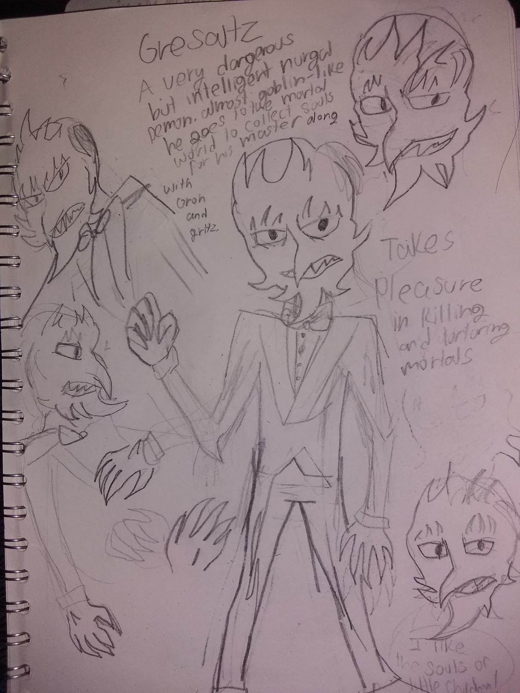 More old paper art I created when I was 17. "Gresaltz,a very dangerous but intelligent nurgal demon almost goblin-like.he goes to the mortal world to collect souls for his master along with Gron and Gritz"