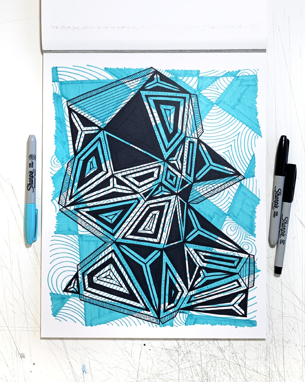 This sketchbook is all about triangle patterns! Each page starts with a base layer of connecting triangles. From there, I fill in different patterns on each page, challenging myself to come up with new ideas for each page.