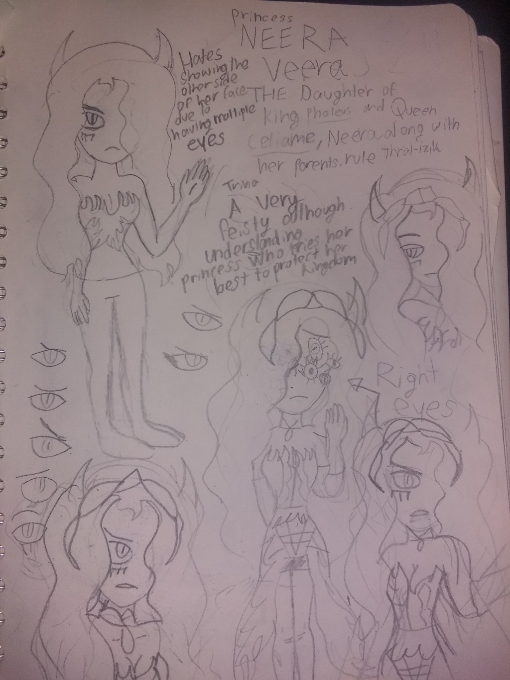 First drawing I did of her as a newly designed character because I did not like the way she looked before.on my sketchbook (it's not great) she's the third female demon I created,she's fun to draw."a very feisty although understanding princess who tries her best to protect her kingdom."