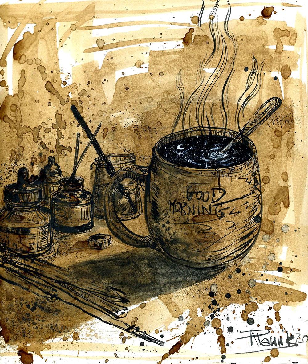 'Good Morning' quick sketch from my sketchbook showing my morning chicory / barley coffee with new morning #quaratine routine. A stared series of quick everyday sketches about mixing everyday food with the ideas of cosmos and universe. Not sure which direction it will go, but the main purpose of it is to draw and draw more especially after sucha long break in drawing....!