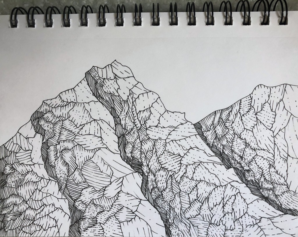 doodling, illustration, mountains, pen and ink, shading, sketchbook
