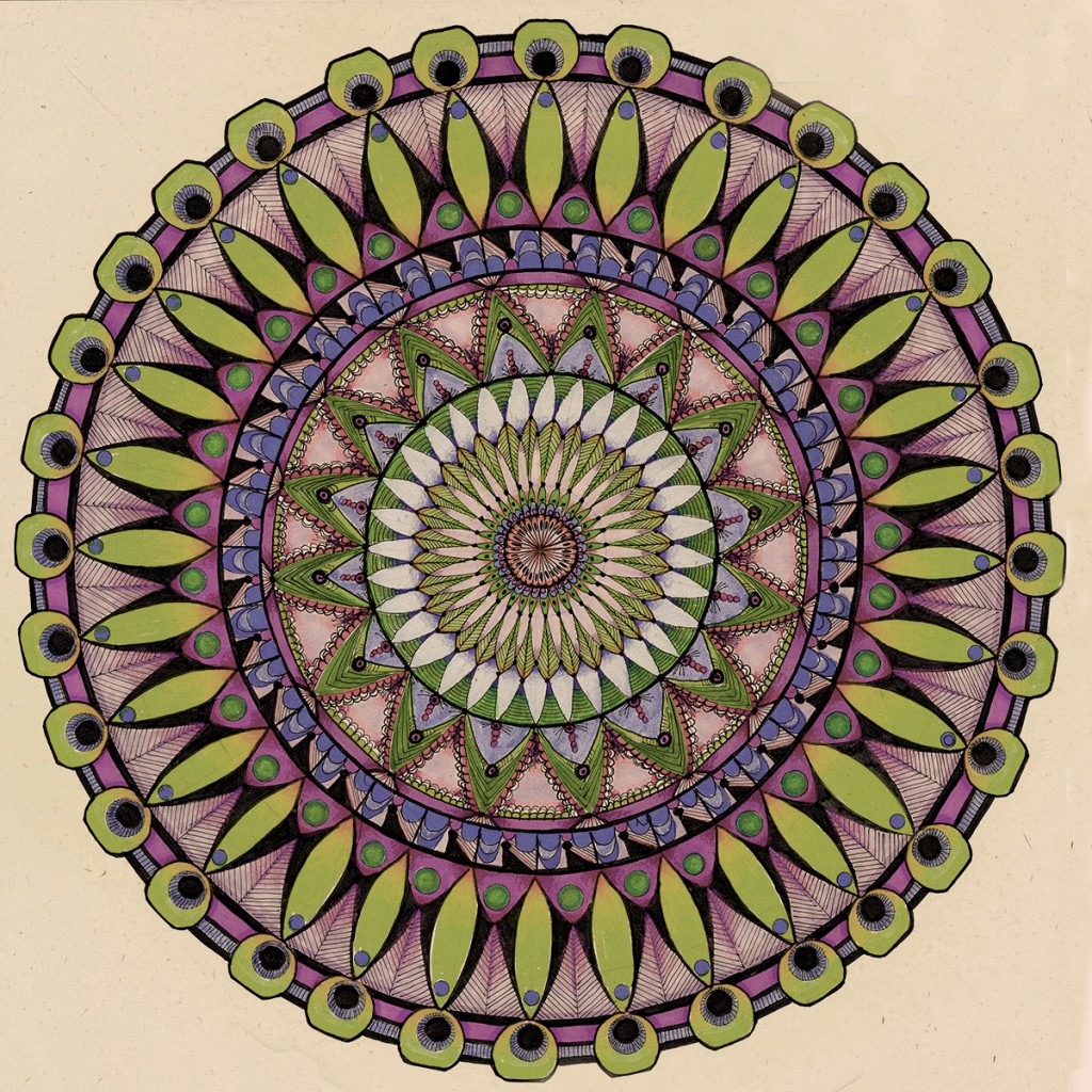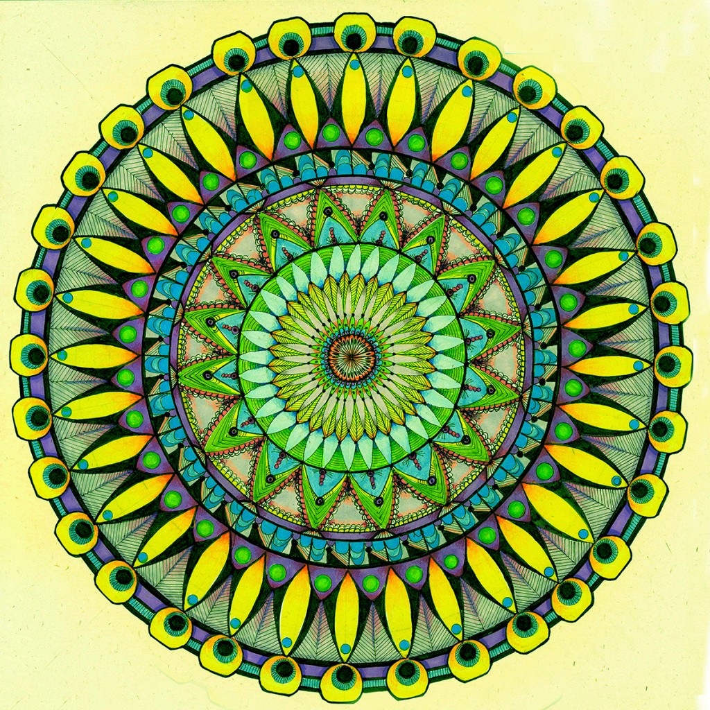 Definitely doodling---This is my first mandela and it ranged from great fun to great frustration. It ended up a little "waby swaby," but I suppose that's in keeping. It's 12 inches across with 32 points. Drawn with a micron pen, then colored in markers (in whatever colors I happened to have) and has colored pencil shadows. I scanned it into PhotoShop and played with altering colors. Made a green one for my green-crazy friend and a subdued desaturated one for myself. It's quite printable on my oversized color laser printer---so ill be a fun "social distancing" poster gift for my friends. Each one with a personal color range.