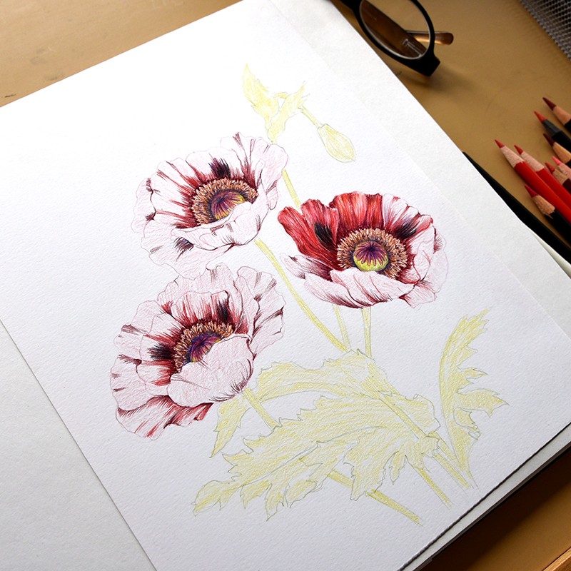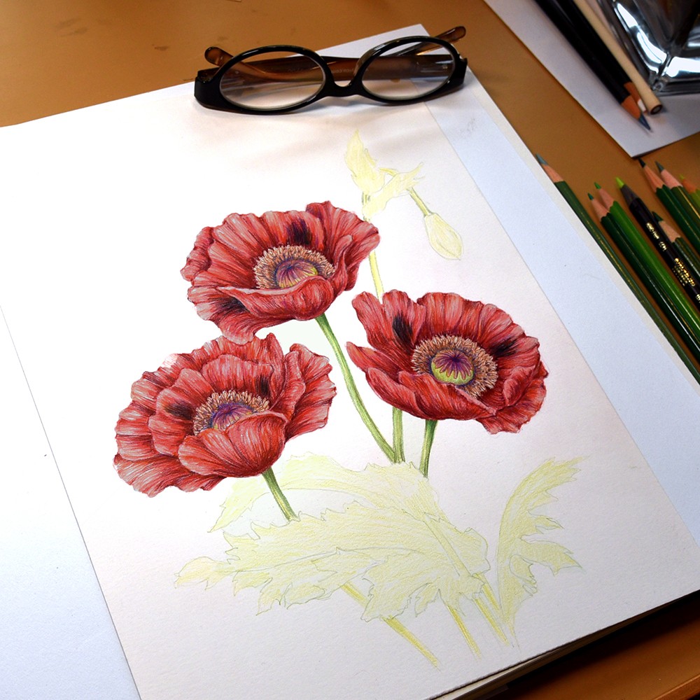 Poppies are among my favorite flowers---vibrant AND delicate. Great swaths of "bread poppies" garnish our garden. We harvest seeds for lemon-seed cake and poppy-seed rolls. (No, we don't harvest that other stuff.) They reseed generously and we have beautiful crops of red and purple flowers each year. I've been working on this colored pencil drawing for the past week. Enclosed are some images of the progress over that time.
